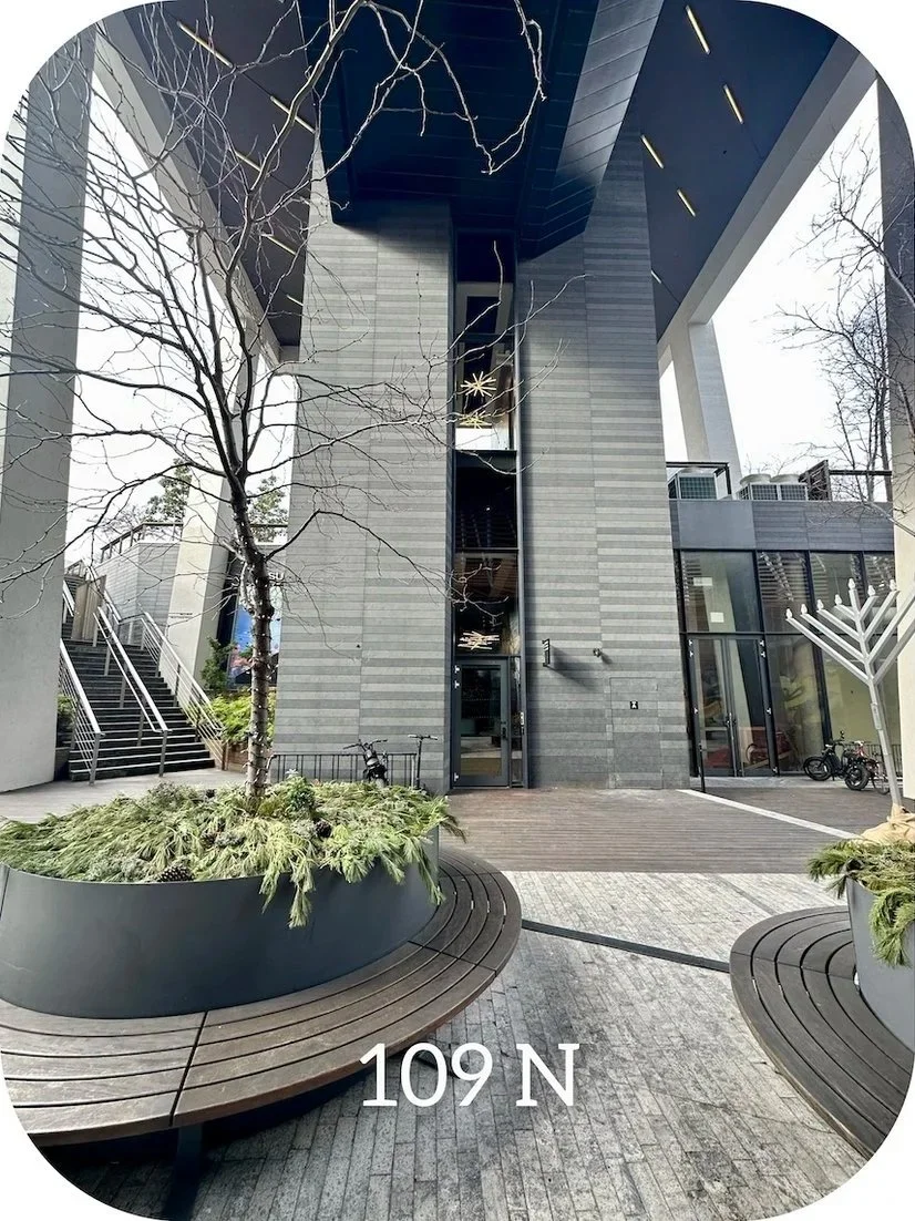 Look across the courtyard from the lobby entrance for the door with the sign “109 N 12th” (next to a bike rack and ATM).